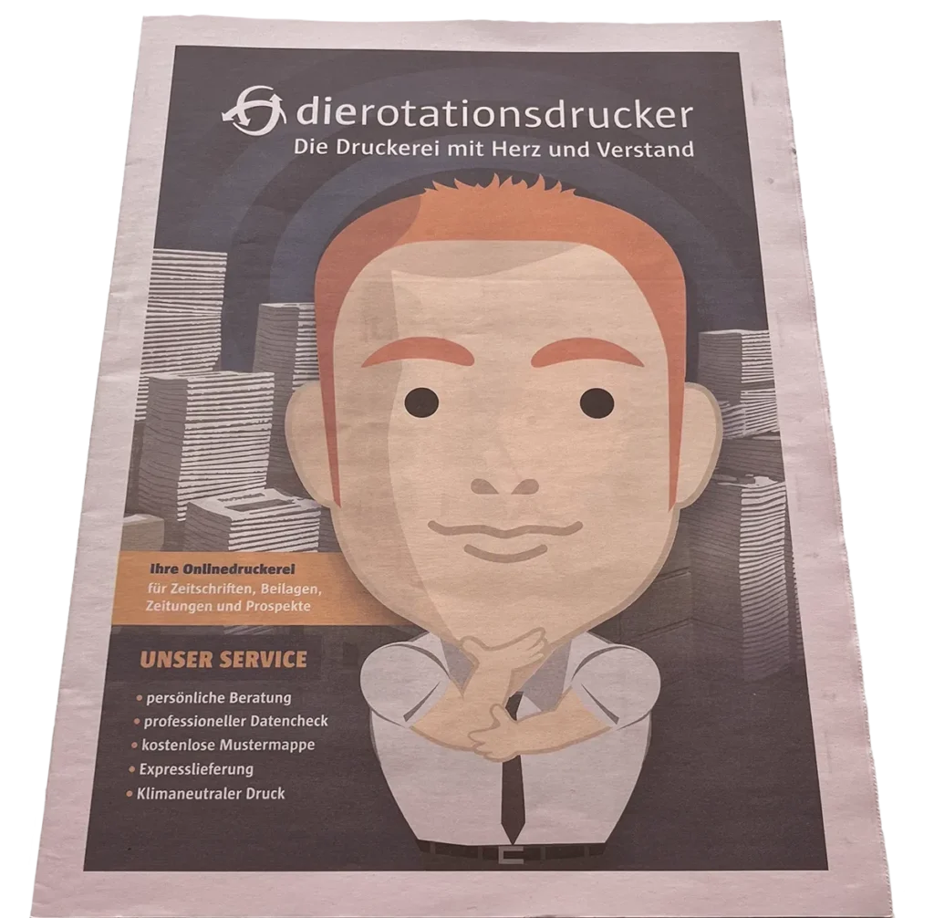 • Grobe Rasterung: Die Rasterpunkte, mit denen Farben im Zeitungsdruck erzeugt werden, sind größer als im hochwertigen Offsetdruck. Dadurch werden die Konturen von Negativschrift weniger scharf abgebildet.